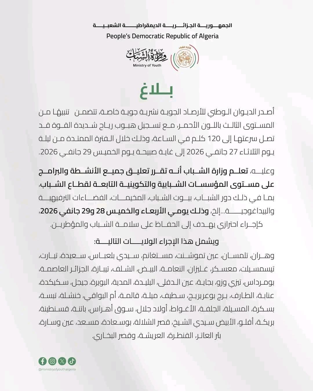 الجزائر | بلاغ هامأصدر الديوان الوطني للأرصاد الجوية نشرية جوية خاصة، تضمّنت تنبيهًا من المستوى…