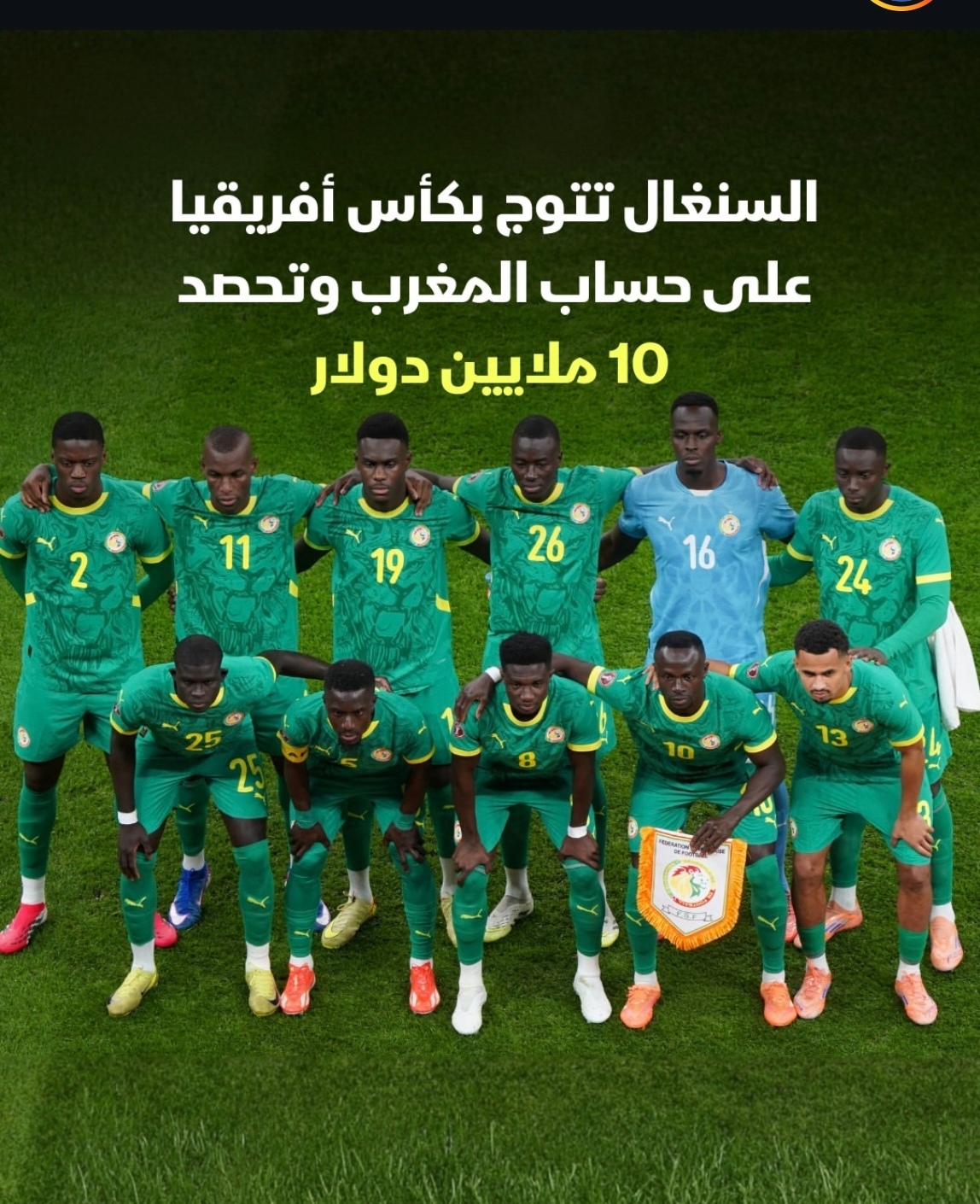 وجاء هدف اللقاء الوحيد ليمنح أسود التيرانغا اللقب القاري الغالي، مؤكّدين حضورهم القوي في سماء الكرة الأفريقية واستمرارهم ضمن كبار القارة. وبهذا التتويج، حصد المنتخب السنغالي جائزة مالية قدرها 10 ملايين دولار، مكافأةً للبطل، تتويجًا لمشوار متوازن وأداء منضبط طوال البطولة.